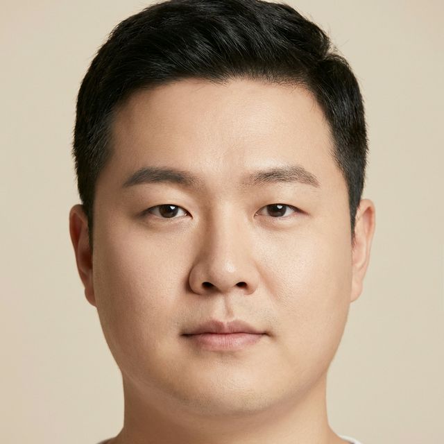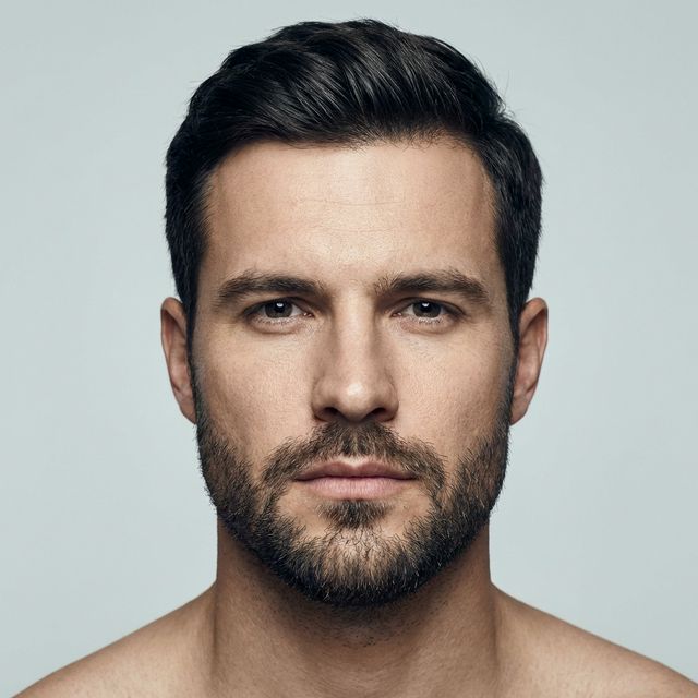 Breiter Kiefer und schmale Stirn. Profitiert von Volumen in der oberen Gesichtshälfte.